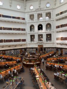 Thursday started with a private tour of the State Library of Victoria. Established in 1854, it is Australia’s oldest public library and is one of the first free public libraries in the world – two years behind Manchester opening its first rates-supported public library. The parallels with Manchester Central Library were significant: the library was created with a vision for it as ‘the people’s university’ – a place of learning and discovery that all Victorians could access. It also seeks to preserve Victorian heritage by collecting items of historical and cultural significance for future generations. It embraces digital library technology, providing online access to its archive, and in 2019, the State Library was transformed an extensive redevelopment project. This project refurbished the library’s heritage spaces, the creation of innovative new spaces for children and teenagers and revamping its services so it can embrace new technologies and promote digital literacy and creativity for all Victorians. This will all sound familiar to regular visitors to Central Library.