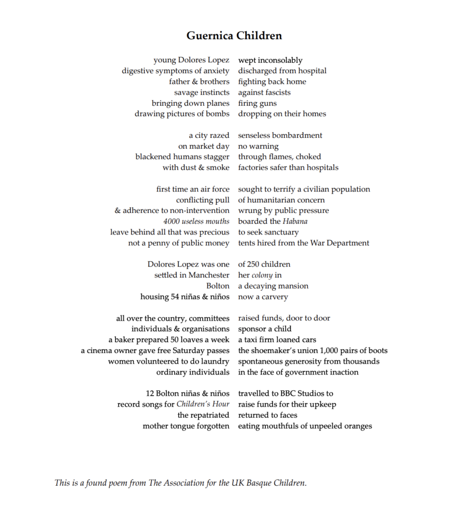 “This poem was inspired by the events of 1937 when the UK took in 4000 Basque children after the bombardment of Guernica. It hopes to draw parallels between that event and current events using the contrapuntal form (a poem that can be read in multiple ways). The poem uses almost entirely found language.”