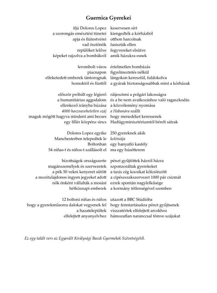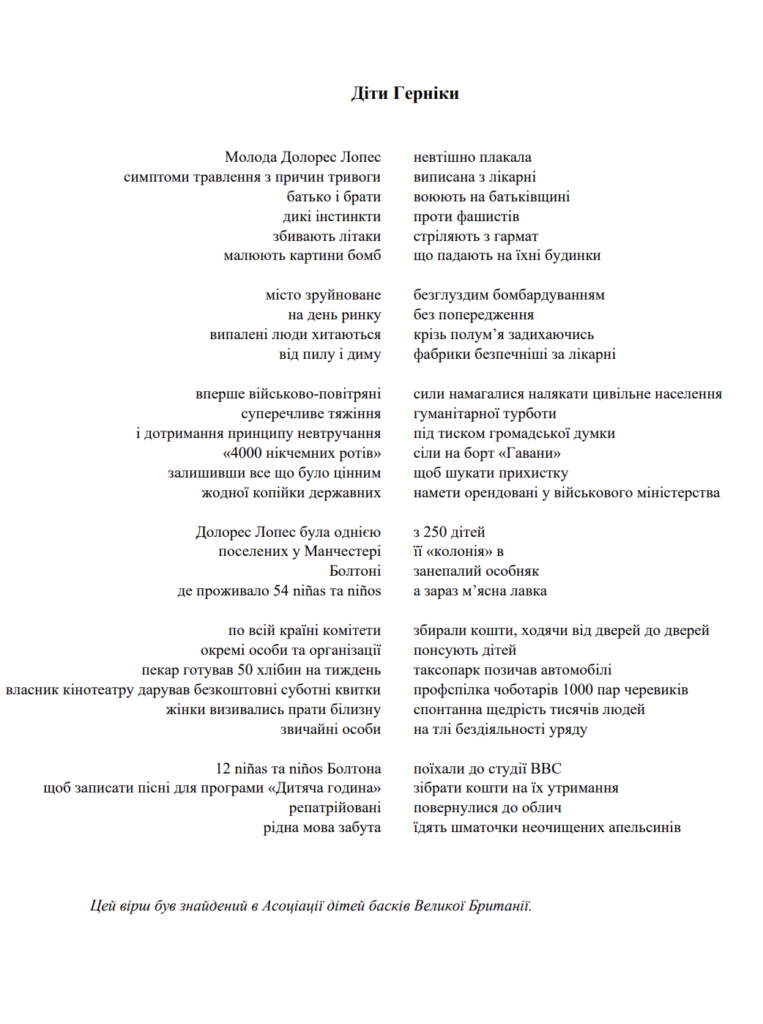 You can read ‘Guernica Children’ below in English, Ukrainian and Hungarian below. (Ukrainian translation by Charlotte Shevchenko Knight.)