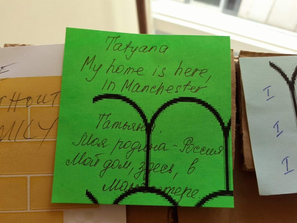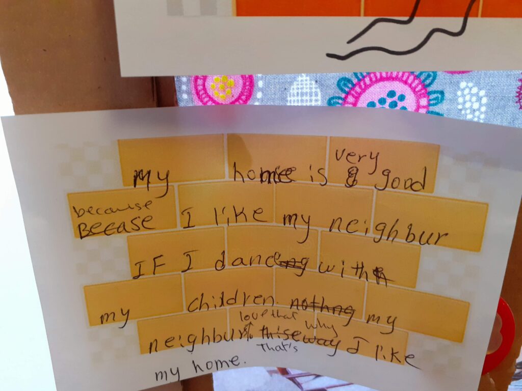 Home is Where the Heart Is was an art and language activity offered to the Talk English foundation stage learners attending a weekly English conversation café at Abraham Moss Library. Learners could express their thoughts about home in a phrase or picture in their own language or English. These written bricks or tiles would decorate a piece of artwork in the shape of a typical home which would be placed on display in North City Library following International Mother Language Day 2020 in which the theme was Home and what it means to everyone. Many learners wrote and drew inspiring simple statements in English and home languages to pin on the house and decorate it to make it look like a Home.