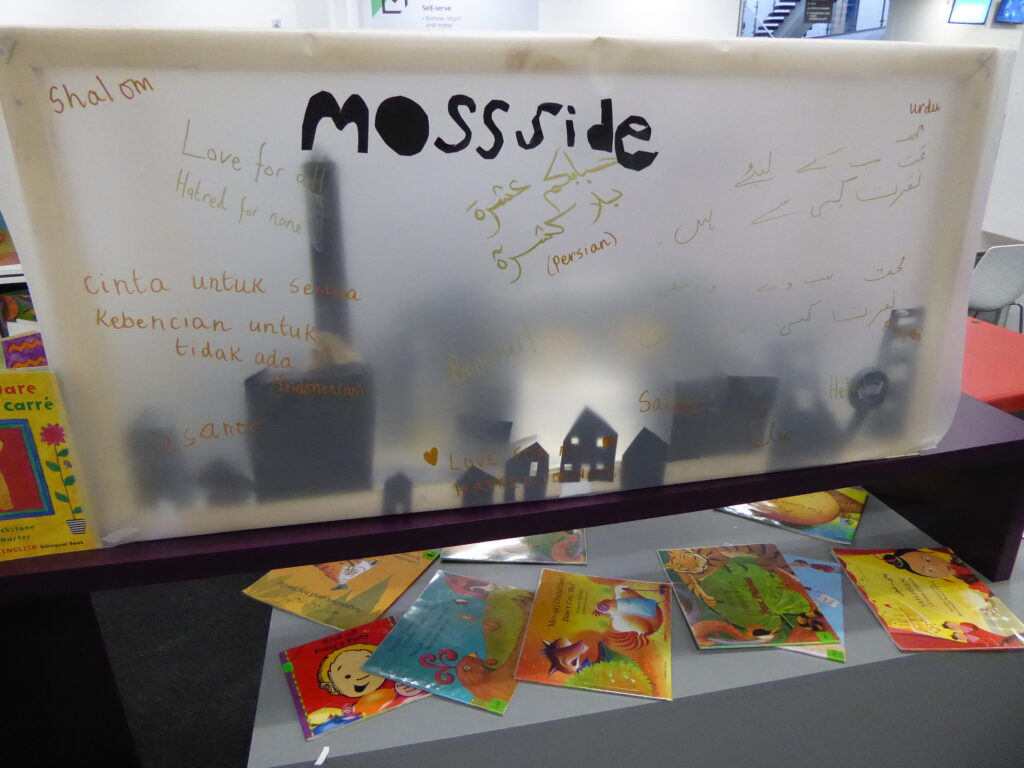 To celebrate International Mother Language Day in 2017, Hulme High St Library got together with both the Sudanese Community and the Ahmadiyya Muslim Community Women’s Group from the Darul Aman mosque. The Sudanese community brought their children’s choir, dressed in the colours of the Sudanese flag. The children ranging from 3 to 16 years delighted everyone with their beautiful singing and all took part in the activities on offer at the library. Local artist, Mandy Cleveland, created an art installation with families and children where they made a silhouetted building sculpture which they were invited to decorate with messages in their first languages. The Ahmadiyya women ran a creative activity that promoted written language in mother tongues as well as delighting all participants with Mhendi hand designs!