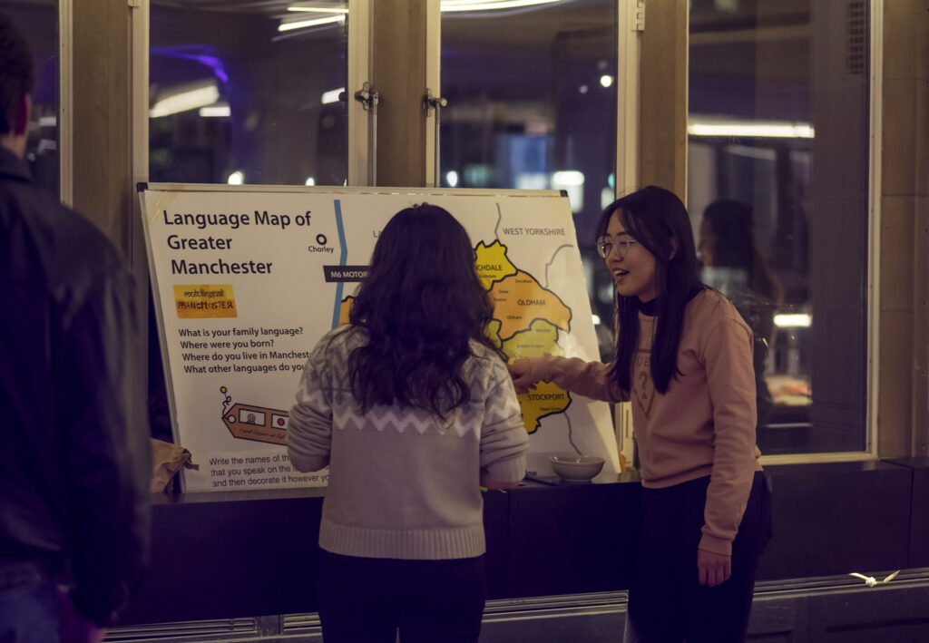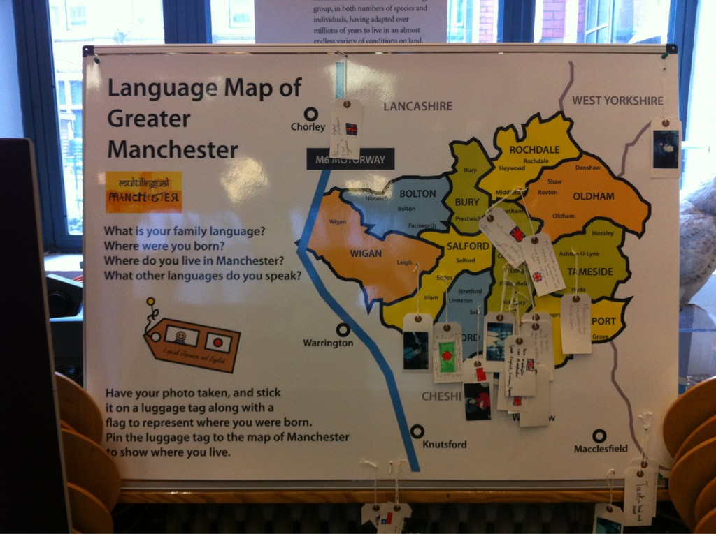 This activity is part of a range of work looking at Linguistic Landscapes and the geographies of languages in Manchester and beyond. Participants were asked to locate the languages that are familiar to them on a large-scale map of the city, creating a visual display of the different languages present in different areas as described by the people involved. The aim of the activity was to show a snapshot of the languages spoken in the city or in a particular area and to encourage participants to talk about languages and their connections to their local community and to do this by pinning tags on a map.