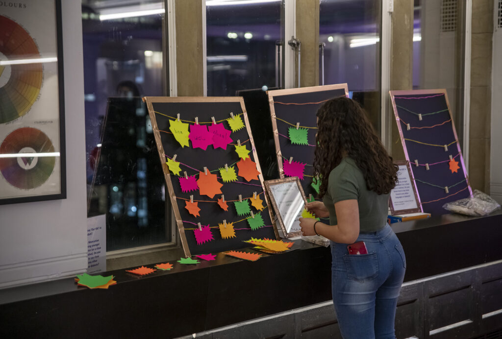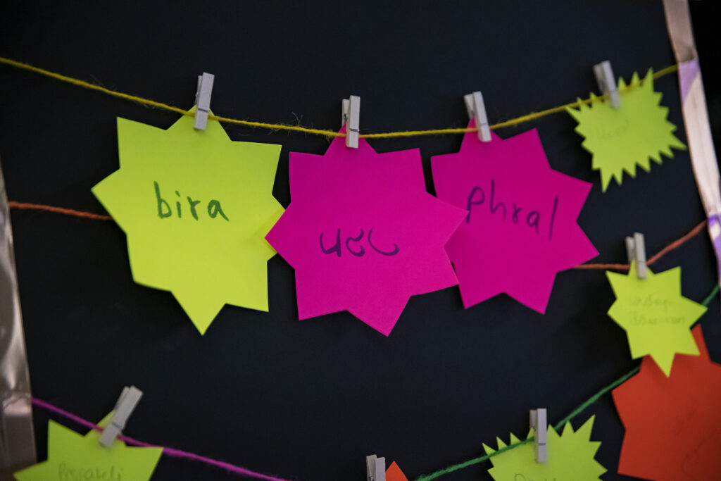 We found that we understood more about participants’ language use by asking them to speak about their artwork, so that we could understand their interpretation – this was done informally by circulating and asking them questions about their pictures. Having participants working on their drawings at the same table encouraged them to take their time with the activity and to interact with other participants sharing their experiences of language.