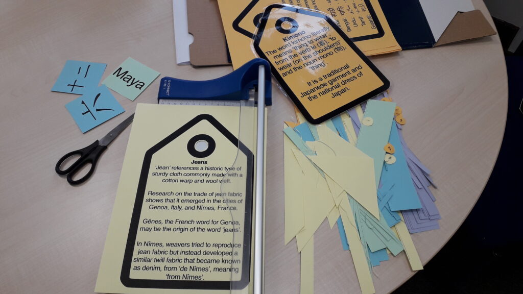 To set our Multilingual Clothes Shop, we took inspiration from the diverse population of Manchester and the colourful clothing that can be seen on its streets and in its shops. Following some research, we made a list of names of garments and other clothing items that we use every day in English and that come from other languages around the world. Some examples are: moccasins – from Powhatan, a Native American language, kimono – from Japanese, pyjamas – from Hindustani, bangle -from Hindi, flannel – from Welsh. We placed labels on clothes tags with a short text describing the origin of the word and its development. Once the clothing items and labels were ready, we displayed them on a clothing rail as if they were in a shop, with a full-length mirror next to it so that participants could try items on and see themselves in the mirror.