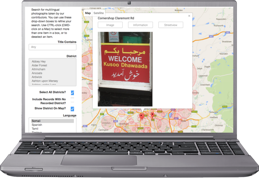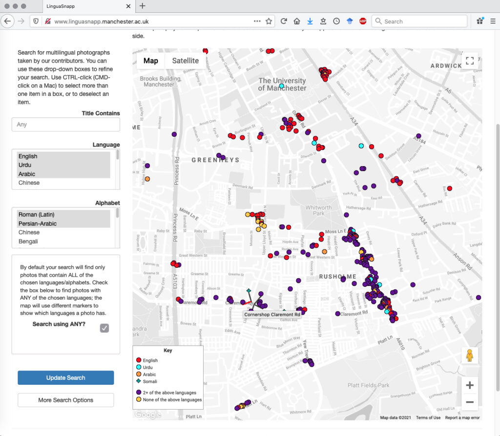 The main purpose of this activity was to raise awareness of how Manchester’s linguistic diversity is made visible on signage across the city, and to allow participants to explore this diversity. The activity draws on LinguaSnapp, a mobile app developed at The University of Manchester to document and explore the linguistic landscape – written language use in public place on shop signs, posters, menus, graffiti, and more. The activity uses LinguaSnapp’s publicly accessible interactive online map, which visualises the geographical distribution of languages or language combinations across Manchester.