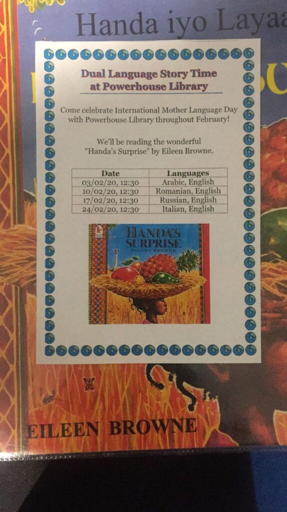 The activity consisted of 4 weekly sessions of dual language story time for pre-school children and their parents over the month of February. The story time sessions were prepared and run by our ESOL group which had been invited by library staff to contribute to the International Mother Language celebrations.