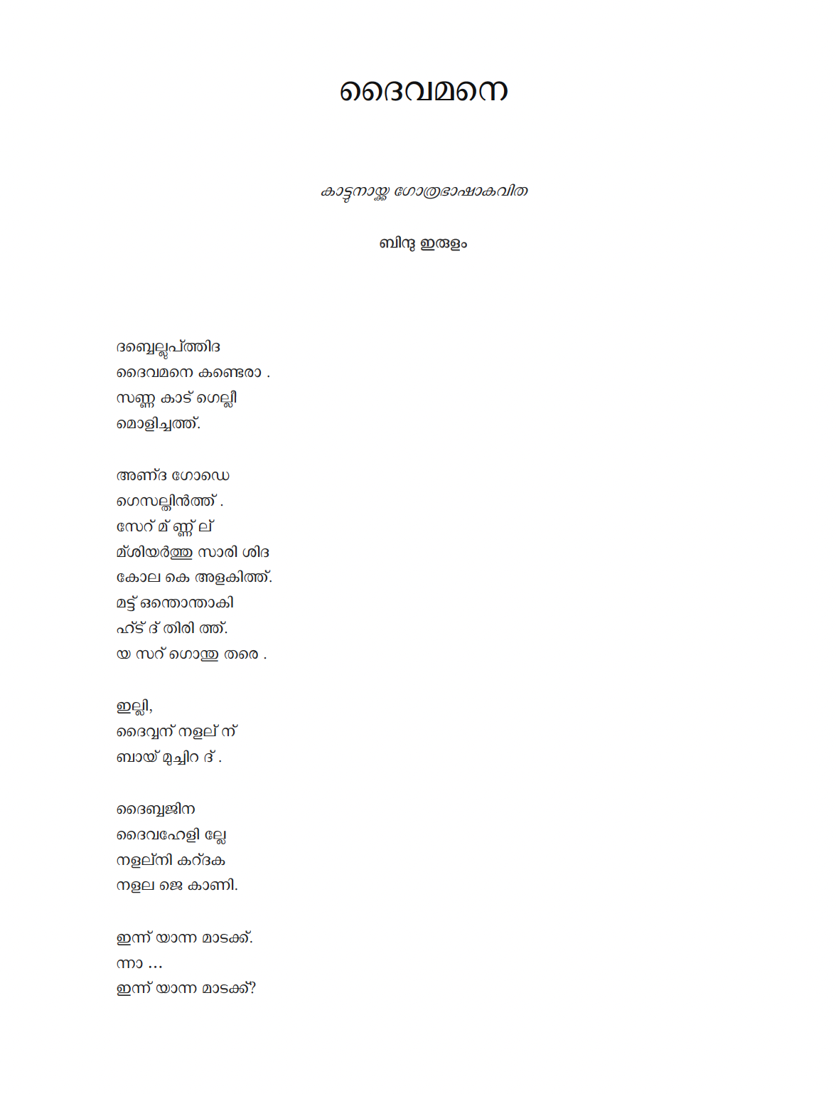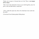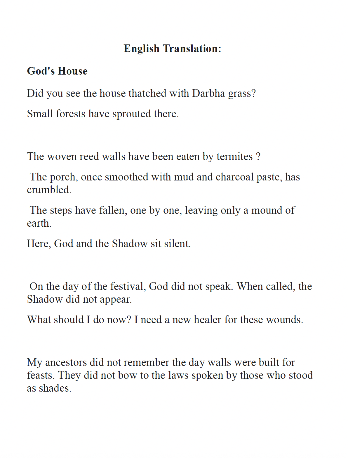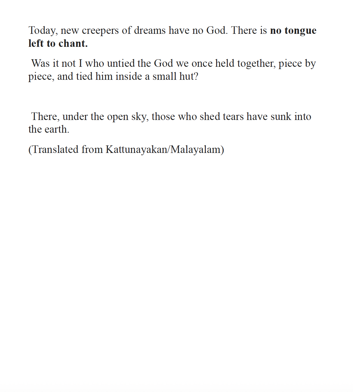 Written in Kattunayakan, this poem acts as a haunting metaphor for the erosion of Indigenous identity. The poet uses the imagery of a crumbling tribal home (‘Daivamane’) to represent the silencing of her community’s ancient language and traditions. As the physical structure returns to the earth, so too does the ‘God’ of their culture fall silent. You can hear the author read the poem further down the page.